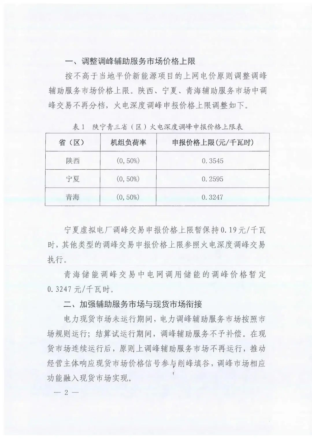 文件明確,按不高于當(dāng)?shù)仄絻r(jià)新能源項(xiàng)目的上網(wǎng)電價(jià)原則調(diào)整調(diào)峰輔助服務(wù)市場(chǎng)價(jià)格上限。陜西、寧夏、青海輔助服務(wù)市場(chǎng)中調(diào)峰交易不再分檔,火電深度調(diào)峰申報(bào)價(jià)格上限調(diào)整如下: