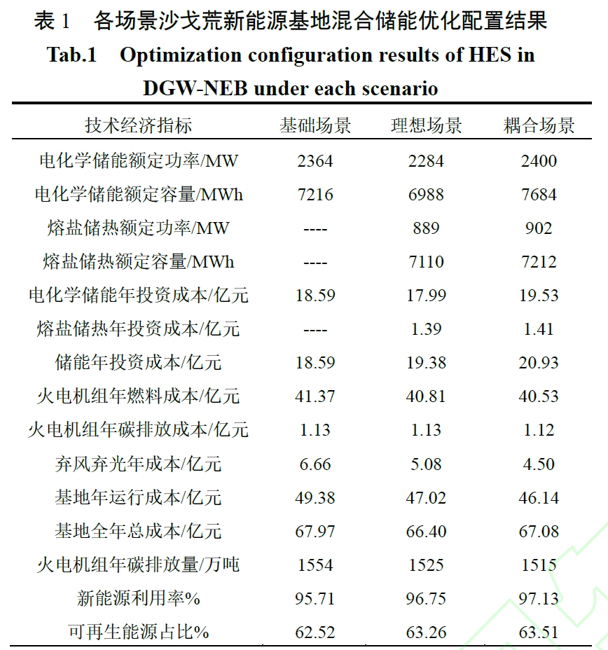 為了分析沙戈荒新能源基地混合儲(chǔ)能配置方案的技術(shù)經(jīng)濟(jì)性,本文基于三種場景進(jìn)行對(duì)比分析:場景1(基礎(chǔ)場景)沙戈荒新能源基地僅配套電化學(xué)儲(chǔ)能;場景2(理想場景)沙戈荒新能源基地配套電化學(xué)儲(chǔ)能和熔鹽儲(chǔ)熱兩種儲(chǔ)能,熔鹽儲(chǔ)熱和火電機(jī)組為理想情況下的簡單組合,忽略火電機(jī)組耦合關(guān)系的理想化模型;場景3(耦合場景)沙戈荒新能源基地配套電化學(xué)儲(chǔ)能和熔鹽儲(chǔ)熱兩種儲(chǔ)能,且考慮火電機(jī)組熔鹽儲(chǔ)熱改造的深度耦合情況,即本文所提模型。各場景下沙戈荒新能源基地混合儲(chǔ)能優(yōu)化配置結(jié)果如表1所示。