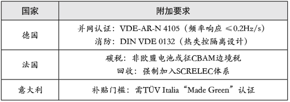 表3 歐洲部分國家對儲能產品附加標準要求