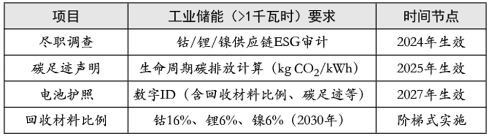 出口到歐盟的儲能產品,需滿足“法規(guī)框架+安全標準 +環(huán)保要求”三位一體的嚴苛體系,涵蓋電池、電力電子、系統(tǒng)集成全鏈條,但《歐盟電池與廢電池法規(guī)》是關鍵影響因素?!稓W盟電池與廢電池法規(guī)》(EU)2023/1542于2023年8月17日正式生效,但關鍵條款分三階段實施。第一階段(從2024年2月18日開始)涉及電池盡職調查和CE標記;第二階段(從2025年8月18日開始)要求便攜式電池可拆卸;第三階段(從2027年2月18日開始)最嚴格,涵蓋碳足跡和回收材料要求。新法規(guī)對電池碳足跡、標志標識、限用物質、電池回收、關鍵材料回收利用、合規(guī)評價認證、盡職調查、電池護照、耐久和性能要求、信息系統(tǒng)構建等方面提出了要求,核心要求見表4。此外,要求必須在銷售國注冊EPR(如德國EAR、法國SCRELEC)并支付回收費。