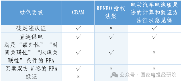 近年來,歐盟先后發(fā)布碳邊境調(diào)節(jié)機(jī)制、非生物來源的可再生燃料授權(quán)法案、歐盟電池與廢電池法等制度,逐步構(gòu)建覆蓋各類產(chǎn)品碳排放標(biāo)準(zhǔn),形成碳貿(mào)易壁壘,產(chǎn)品碳排放過高將面臨高額碳成本或禁售。使用綠電可幫助出口企業(yè)降低碳排放,提高其產(chǎn)品國際市場競爭力,有效應(yīng)對國際碳貿(mào)易壁壘。相關(guān)政策對綠電提出了明確要求,并詳細(xì)分析如下: