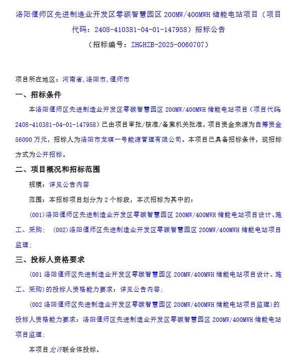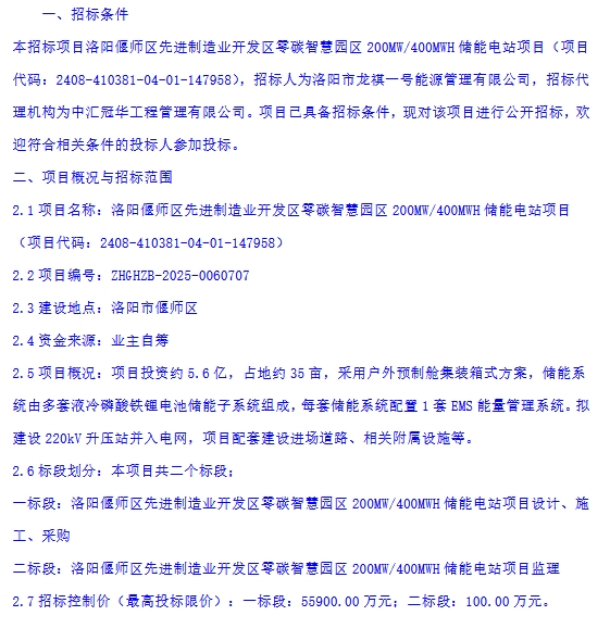 中國儲能網(wǎng)訊:7月7日,洛陽市龍祺一號能源管理有限公司發(fā)布洛陽偃師區(qū)先進(jìn)制造業(yè)開發(fā)區(qū)零碳智慧園區(qū)200MW/400MWh儲能電站項目招標(biāo)公告。項目位于河南省洛陽市偃師市,一標(biāo)段招EPC總承包,最高投標(biāo)限價55900萬元,折合單價1.398元/Wh,二標(biāo)段招監(jiān)理。
