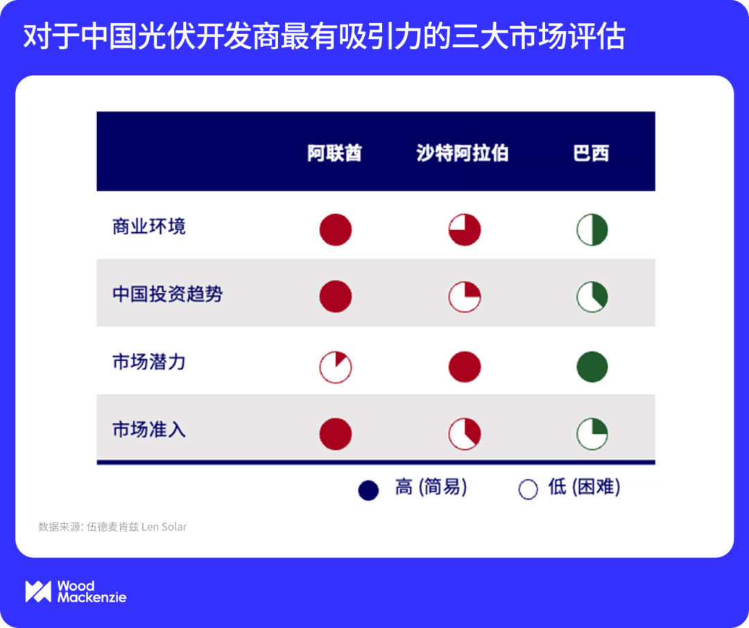 伍德麥肯茲基于商業(yè)環(huán)境、投資慣性、市場潛力和準入難度進行市場吸引力評估,發(fā)現(xiàn)排名前三的阿聯(lián)酋、沙特、巴西市場具有共同特點:政策協(xié)同度較高、電力需求高增長與準入壁壘較低。