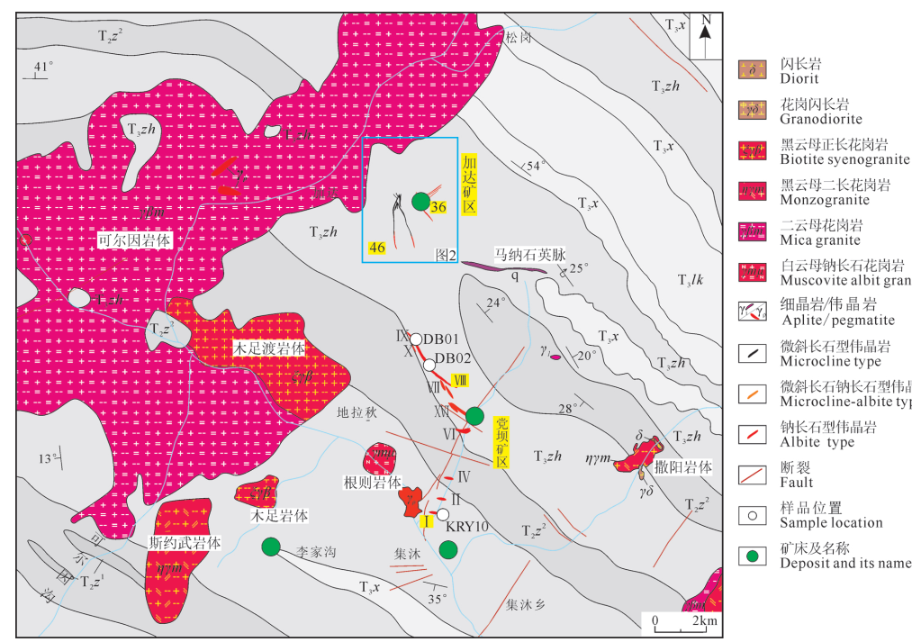 馬爾 康 礦 田 地 層 包 括 中 三 疊 統(tǒng) 雜 谷 腦 組(T2z),上三疊統(tǒng)侏倭組(T3zh)、新都橋組(T3x)、羅空松多組(T3lk),及零星分布的第四系(Q)(圖1)。其中,中三疊統(tǒng)雜谷腦組巖性為碳酸鹽巖、變質(zhì)長(zhǎng)石石英細(xì)砂巖、絹云板巖,上三疊統(tǒng)侏倭組巖性為變質(zhì)砂巖、泥質(zhì)板巖,新都橋組巖性為絹云母板巖、鈣質(zhì)板巖,羅空松多組巖性為變質(zhì)砂巖、千枚巖。礦田內(nèi)構(gòu)造主要為褶皺、斷層等,走向分為北西向、北東向和近東西向三組。其中,巖漿活動(dòng)晚期構(gòu)造為早期復(fù)活斷裂及相伴產(chǎn)生的廣泛剪節(jié)理,其控制著閃長(zhǎng)巖脈、長(zhǎng)英質(zhì)脈、偉晶巖脈等脈體產(chǎn)狀,對(duì)馬爾康礦田成礦具有重要的意義。