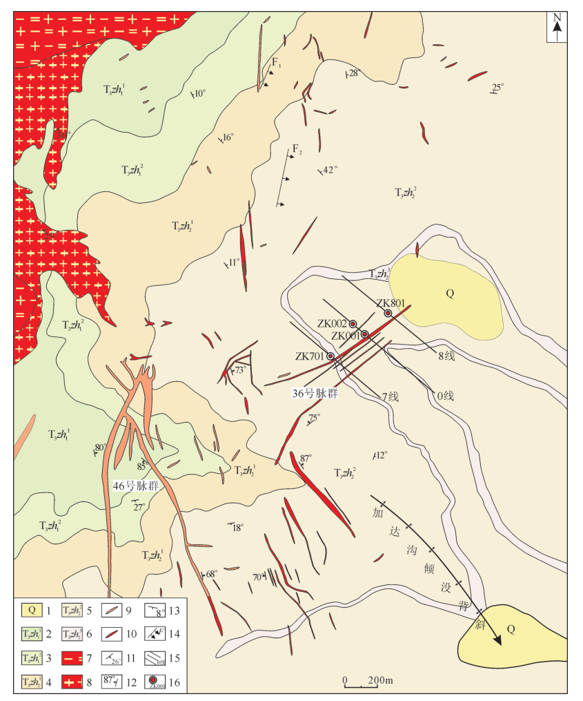 T3lk—羅空松多組;T3x—新都橋組;T3zh—侏倭組;T2z2—雜谷腦組上段;T2z1—雜谷腦組下段;q—石英脈