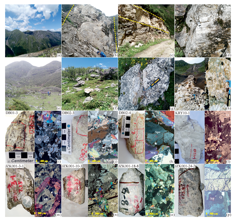 (a)—馬爾康礦田地形地貌;(b)—業(yè)隆礦區(qū)陡傾的偉晶巖脈;(c)—集沐大渡 河 邊 緩 傾 的 偉 晶 巖 脈;(d)—黨壩Ⅷ號(hào) 鈉 長(zhǎng) 石 鋰 輝 石 偉 晶 巖 露 頭; (e)—加達(dá)礦區(qū)地形地貌及殘積-坡積礫石;(f)—加達(dá)含 鋰 輝 石 偉 晶 巖 轉(zhuǎn) 石 的 坡 積 碎 石 帶;(g)—加 達(dá) 礦 區(qū) 山 頂 平 地 殘 積 的 鋰 輝 石 偉 晶 巖 碎 石(高程4150m);(h)—加達(dá)礦區(qū)東部馬納螢石石英脈(高程4060m);(i)—黨壩Ⅷ號(hào)礦脈北段 DB01-3樣品礦物組合(高程3900m);(j)—黨壩Ⅷ號(hào)礦脈中段 DB02-3樣品礦物組合;(k)—黨壩Ⅷ號(hào)礦脈中段 DB02-4樣品礦物組合(高程3700m);(l)—地拉秋Ⅰ號(hào)脈中部 KRY10-1樣品礦物組合(高程2450m);(m)—加達(dá)JZK001鉆孔7.2m 進(jìn)尺含鈮鉭鐵礦鈉長(zhǎng)石偉晶巖脈(高程4127m);(n)—加達(dá)JZK001鉆孔58.5m 進(jìn)尺含白云母鈉長(zhǎng)石鋰輝石偉晶巖(高程4090m);(o)—加達(dá)JZK001鉆孔146m 進(jìn) 尺 含 白 云 母 鈉 長(zhǎng) 石 磷 鋰 鋁 石 鋰 輝 石 偉 晶巖(高程4029m);(p)—加達(dá)JZK001鉆孔174m 進(jìn)尺含錫石鈉長(zhǎng) 石 鋰 輝 石 偉 晶 巖(高程 4009m);Mu—白云 母;Ab—鈉 長(zhǎng) 石;Qz—石 英;Spo—鋰 輝 石;Mon—磷 鋰 鋁 石; Fer—鐵磷鋰錳礦;Nt—鈮鉭鐵礦;Sn—錫石