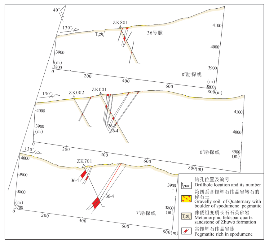 從控制36號(hào)脈群的0、7、8號(hào)測(cè)線對(duì)應(yīng)的電阻率剖面,結(jié)合地質(zhì)特征分析(圖4、5),可以得出如下判斷:① 高密度剖面實(shí)測(cè)視電阻率值介于1×103~ 24×103(Ω·m)區(qū)間,數(shù)值范圍達(dá)一個(gè)數(shù)量級(jí)。整體來(lái)看,反演擬斷面基本呈現(xiàn)水平方向和垂直方向高低阻相間分布的電性展布特征。結(jié)合地表地質(zhì)特征和鉆探工程揭露,初步推斷呈近水平高-低阻異常對(duì)應(yīng)的地質(zhì)單元為變質(zhì)長(zhǎng)石石英砂巖或緩傾斜的偉晶巖和含碳質(zhì)變質(zhì)黑云母長(zhǎng)石石英砂巖;陡傾的高-低阻異常為陡傾的偉晶巖脈群或長(zhǎng)英質(zhì)脈群和三疊系含水破碎帶或孔隙水、裂隙水含量較多的層位。② 在高 密 度 電 法 有 效 探 測(cè) 深 度 范 圍 內(nèi) (150m 以淺),陡傾高阻異常的視電阻率值一般為相鄰陡傾低電阻率異常的視電阻率值5~10倍,如8# 線的8-2、0# 線的0-2、7# 線的7-3等 陡 傾 高 阻 異 常及其右側(cè)相鄰的陡傾低阻異常(圖4)。以0# 線45~55測(cè)點(diǎn)為例,對(duì)應(yīng)0-2號(hào)高阻帶電阻率界線值為15000Ω·m,而其右側(cè)低阻帶界線值低至2500Ω·m(圖4)。③陡傾的高阻異常淺部延伸至地表,常見偉晶巖轉(zhuǎn)石或原巖露頭分布。以0# 線為例,50~52測(cè)點(diǎn)對(duì)應(yīng)的0-2號(hào)隱伏高電阻率異常帶,其延伸至地表對(duì)應(yīng)的第四系碎石層,皆有風(fēng)化剝蝕成因的殘積鋰輝石偉晶巖碎石,表明陡傾的高阻異常極可能為深部隱伏的陡傾含鋰輝石偉晶巖脈(群)引起;結(jié)合隱伏高阻帶特征和地表鋰輝石碎石帶分布寬度,推斷隱伏偉晶巖脈(群)或長(zhǎng)英質(zhì)脈(群)寬度約40m(圖4)。為驗(yàn)證與地表鋰輝石偉晶巖轉(zhuǎn)石帶或基巖露頭深部延伸情況,明確其與陡傾高阻異常是否存在空間關(guān)系,設(shè)置相關(guān)勘探剖面、鉆孔驗(yàn)證(圖4)。
