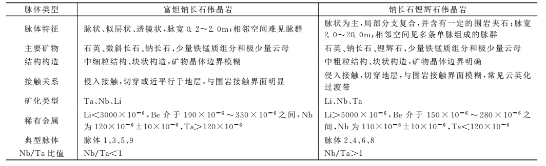 馬爾康礦田花崗偉晶巖脈多成群、成帶分布,脈體類型主要為微斜長(zhǎng)石型、微斜長(zhǎng)石-鈉長(zhǎng)石型、鈉長(zhǎng)石型、鈉長(zhǎng)石鋰輝石型、鈉長(zhǎng)石鋰云母型、螢石錫石硫化物型(表1)。因地形切割強(qiáng)烈、多期次巖漿熱液活動(dòng)疊加顯著,局部脈體類型特征和脈群分帶規(guī)律性不顯著。野外地質(zhì)調(diào)查顯示礦化偉晶巖脈多分布于侏 倭 組、雜 谷 腦 組 的 變 質(zhì) 長(zhǎng) 石 石 英 砂 巖巖性段,空間上受北西向、北東向兩組共軛節(jié)理控制。礦脈 空 間 分 布 于 可 爾 因 巖 體 外 圍 水 平 距 離1500~5000m、高 程 3750~4200m 范 圍 內(nèi)。礦 脈類型 以 鈉 長(zhǎng) 石 鋰 輝 石 型 為 主,其 走 向 長(zhǎng) 100~ 2500m 不等,礦 化 類 型 以 鋰 為 主,兼 有 鈹、鈮、鉭、銣、錫等共伴生組分。
