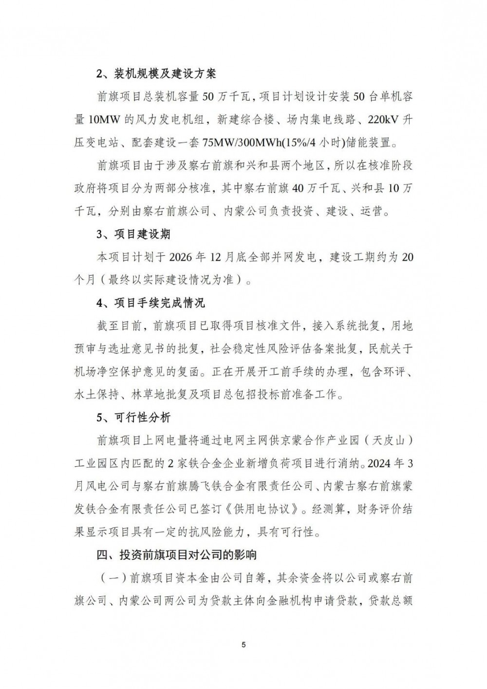 前旗項(xiàng)目由于涉及察右前旗和興和縣兩個地區(qū),所以在核準(zhǔn)階段政府將項(xiàng)目分為兩部分核準(zhǔn),其中察右前旗40萬千瓦、興和縣10萬千瓦,分別由察右前旗公司、內(nèi)蒙公司負(fù)責(zé)投資、建設(shè)、運(yùn)營。
