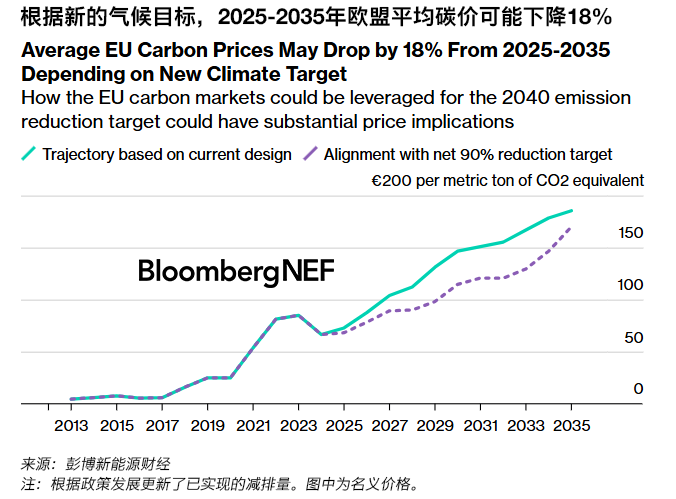 如果歐盟ETS I上限與氣候目標(biāo)一致,彭博新能源財(cái)經(jīng)預(yù)測的2025-2035年歐盟碳價(jià)平均降幅