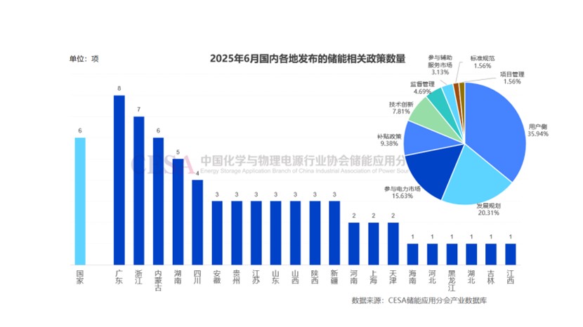 中國儲能網(wǎng)訊:據(jù)CESA儲能應(yīng)用分會產(chǎn)業(yè)數(shù)據(jù)庫不完全統(tǒng)計,2025年6月份共發(fā)布儲能相關(guān)政策69項,其中國家層面發(fā)布6項,發(fā)展規(guī)劃、監(jiān)督管理類政策各有2項,標準規(guī)范、新能源配儲類政策各有1項。