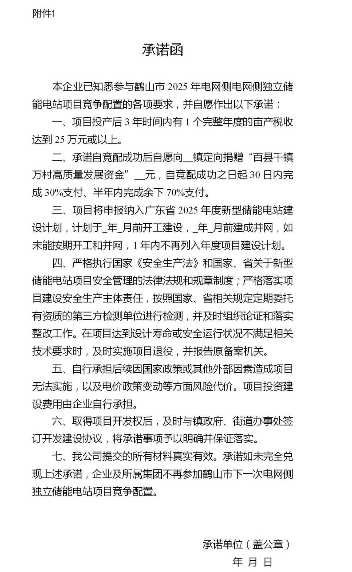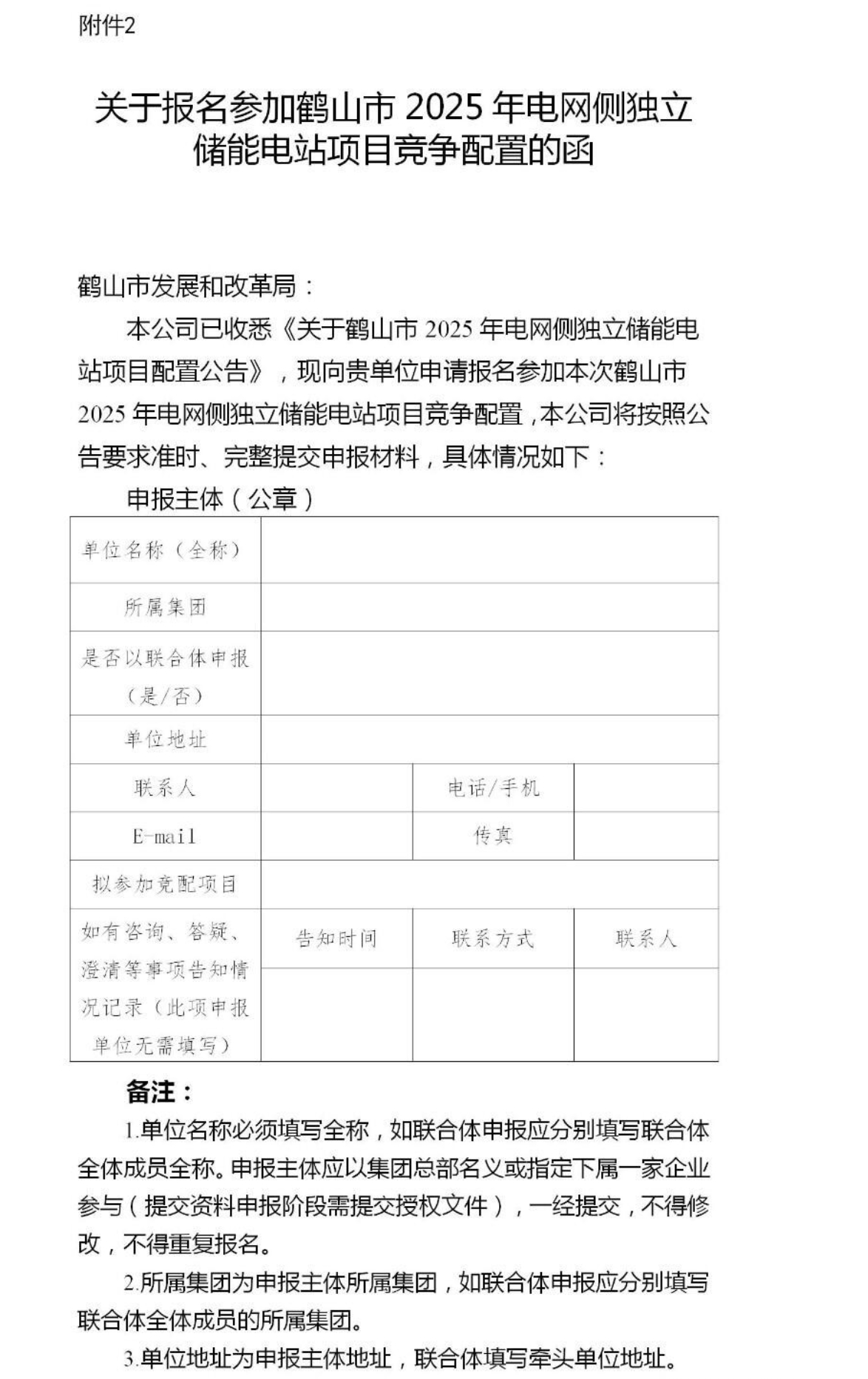 牽頭主體或聯(lián)合體主體提交參加鶴山市2025年電網(wǎng)側(cè)獨(dú)立儲(chǔ)能電站競爭配置的函。