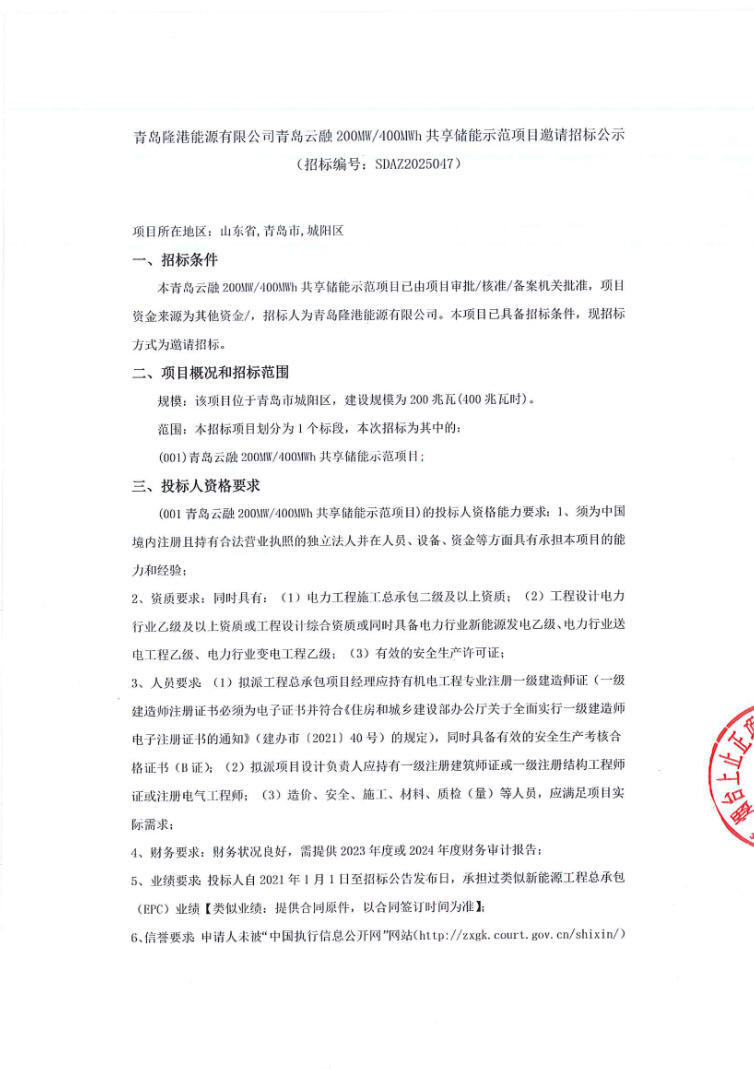 中國(guó)儲(chǔ)能網(wǎng)訊:7月10日,青島隆港能源有限公司青島云融200MW/400MWh共享儲(chǔ)能示范項(xiàng)目邀請(qǐng)招標(biāo)公示,招標(biāo)人為青島隆港能源有限公司。該項(xiàng)目位于青島市城陽(yáng)區(qū),建設(shè)規(guī)模為200兆瓦(400兆瓦時(shí))。