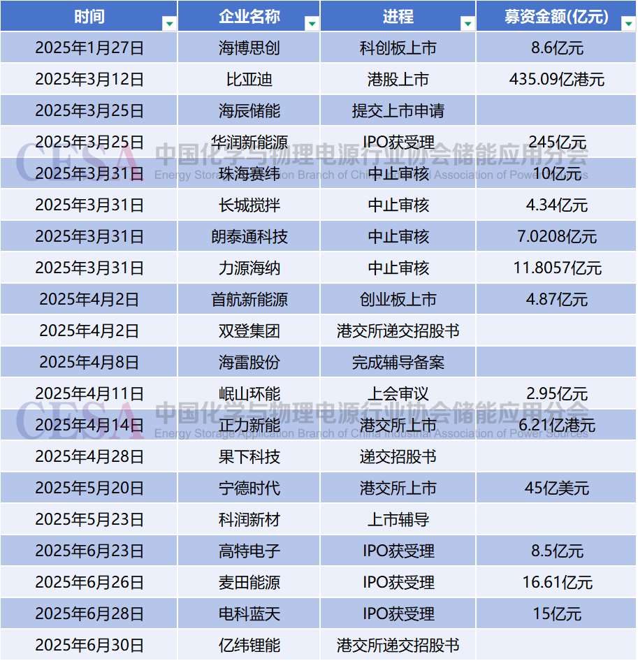 2025年上半年,中國儲能行業(yè)迎來IPO市場的爆發(fā)式增長。據(jù)CESA儲能應(yīng)用分會產(chǎn)業(yè)數(shù)據(jù)庫不完全統(tǒng)計,上半年共有20家企業(yè)加速推進(jìn)資本化進(jìn)程,募資總額突破千億規(guī)模達(dá)1089.3億元。其中5家企業(yè)已成功登陸資本市場,4家因?qū)徍肆鞒陶{(diào)整暫時中止推進(jìn),另有11家處于前期籌備階段,市場呈現(xiàn)多元發(fā)展格局。這一數(shù)據(jù)既反映出行業(yè)資本化進(jìn)程的加速態(tài)勢,也凸顯出企業(yè)在上市進(jìn)程中因資質(zhì)、策略差異形成的階段性分化特征。