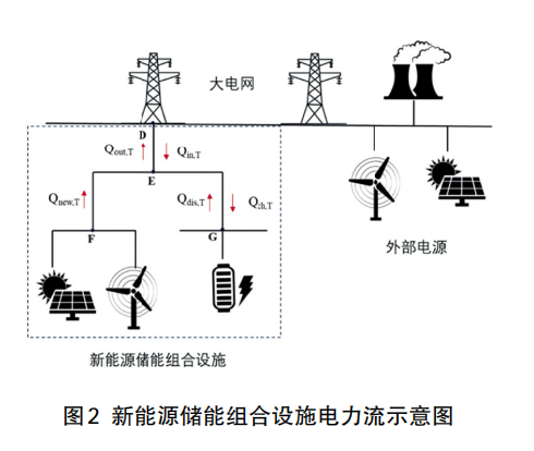圖2展示了電源側新能源配儲與大電網(wǎng)交互的電力流,研究邊界是新能源和儲能結合的組合設施,新能源發(fā)出的電力直接送上電網(wǎng)或者流入儲能設施,大電網(wǎng)下網(wǎng)電力流入儲能設施,儲能設施放電送上電網(wǎng)。