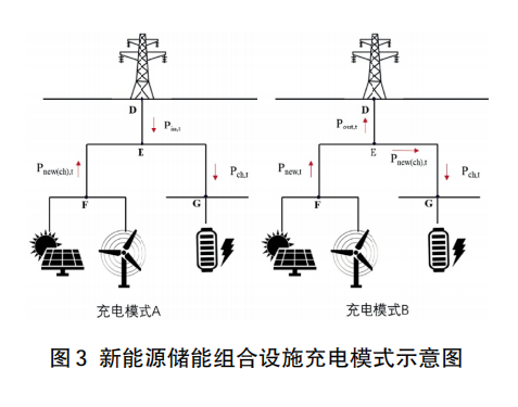 實際儲能的充電電量包含兩部分,一部分是新能源所發(fā)用于儲能充電的充電電量Qnew(ch),T,一部分是大電網(wǎng)下電用于儲能充電的充電電量Qin(ch),T,由圖3中的兩種充電模式下的電力流可以發(fā)現(xiàn),從大電網(wǎng)下電僅能用于儲能充電,即大電網(wǎng)下電功率Pin,t等于大電網(wǎng)下電用于儲能充電的功率Pin(ch),t,因此大電網(wǎng)下電用于儲能充電的充電電量就等于大電網(wǎng)下電電量Qin(ch),T=Qin,T。
