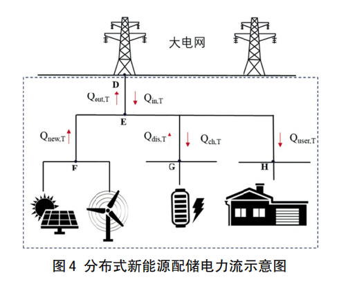 考慮儲能損耗的精確計量,在圖4中考慮周期T時間內節(jié)點E的電量平衡,即Qnew,T+Qin,T+Qdis,T=Qout,T+Qch,T+Quser,T,這時,新能源發(fā)電量可以用于用戶用電、儲能充電和上網(wǎng),下網(wǎng)電量可以用于用戶用電和儲能充電,在電量層面用戶用電量中難以區(qū)分由新能源發(fā)電量提供的部分和下網(wǎng)電量提供的部分,上網(wǎng)電量中也難以區(qū)分新能源發(fā)電提供的上網(wǎng)部分和下網(wǎng)電量經(jīng)過儲能重新上網(wǎng)的部分。