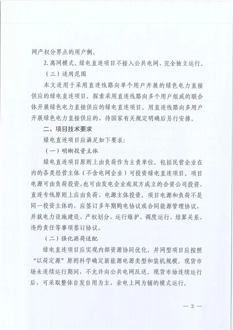 方案適用于采用直連線路向單個用戶開展的綠色電力直接供應(yīng)的綠電直連項目。探索采用直連線路向多個用戶組成的聯(lián)合體開展綠色電力直接供應(yīng)的綠電直連項目。用直連線路向多用戶開展綠色電力直接供應(yīng)的,待國家有關(guān)規(guī)定明確后另行安排。