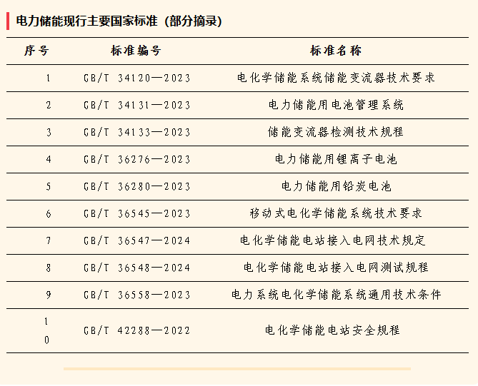 當(dāng)前我國儲能領(lǐng)域步入關(guān)鍵的標(biāo)準(zhǔn)化發(fā)展階段,標(biāo)準(zhǔn)體系基本完備,涵蓋基礎(chǔ)通用、規(guī)劃設(shè)計、施工及驗收、運行與維護、檢修、設(shè)備及試驗、安全環(huán)保、技術(shù)管理等方面。2024年全國電力儲能標(biāo)委會發(fā)布電化學(xué)儲能相關(guān)國家標(biāo)準(zhǔn)18項、行業(yè)標(biāo)準(zhǔn)3項?!秷蟾妗芬矊ο盗袠?biāo)準(zhǔn)進(jìn)行了列舉,方便查閱參考。