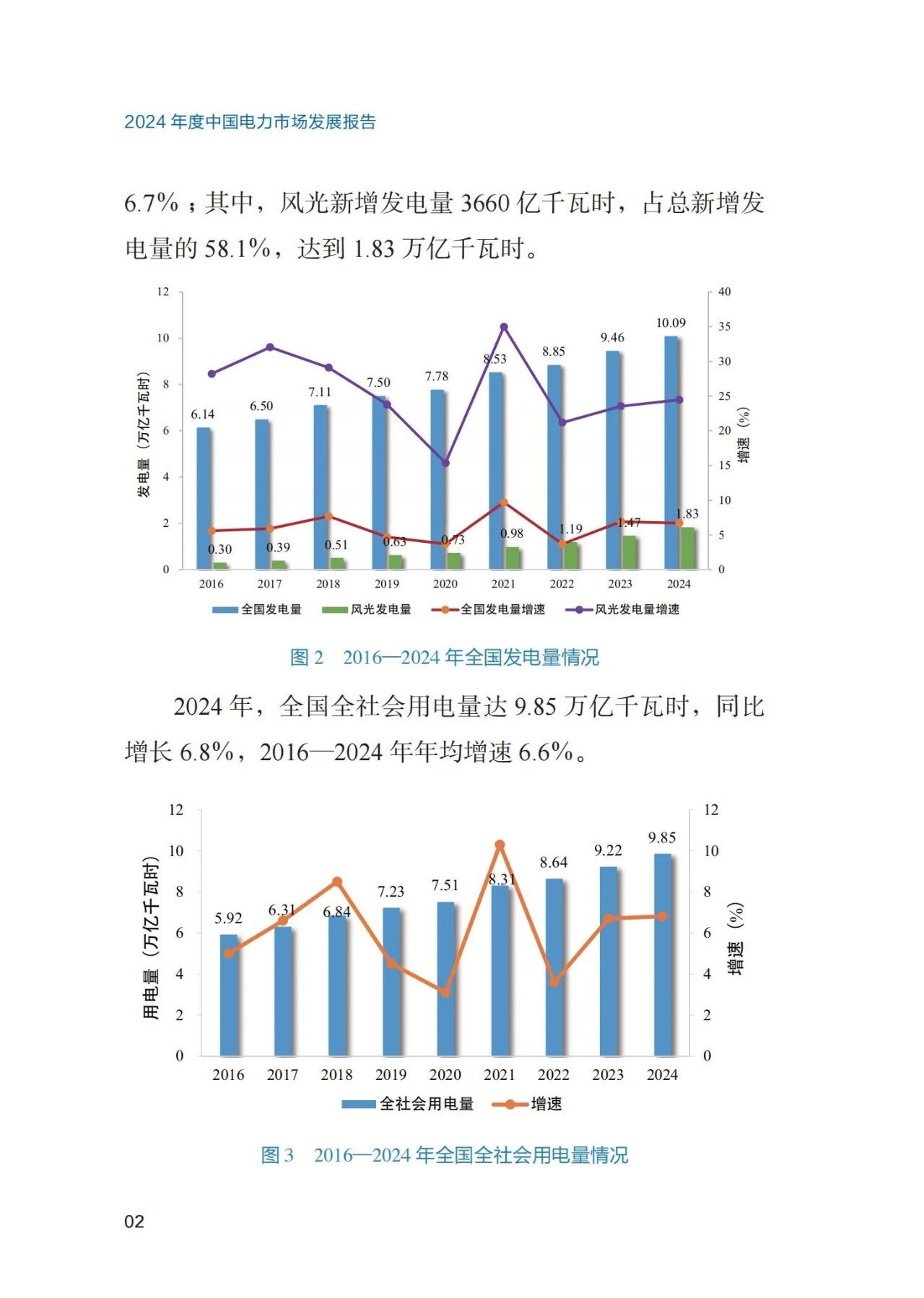 2024 年,全國發(fā)電量10.09萬億千瓦時,同比增長6.7%;其中,風光新增發(fā)電量3660億千瓦時,占總新增發(fā)電量的58.1%,達到1.83萬億千瓦時。2024年,全國全社會用電量達9.85萬億千瓦時,同比增長 6.8%,2016—2024年年均增速 6.6%。
