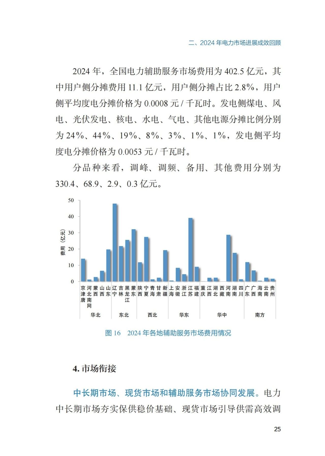 2024年,全國電力輔助服務市場費用為402.5億元,其中用戶側(cè)分攤費用11.1億元,用戶側(cè)分攤占比2.8%,用戶側(cè)平均度電分攤價格為0.0008元/千瓦時。發(fā)電側(cè)煤電、風電、光伏發(fā)電、核電、水電、氣電、其他電源分攤比例分別為 24%、44%、19%、8%、3%、1%、1%,發(fā)電側(cè)平均度電分攤價格為0.0053元/千瓦時。