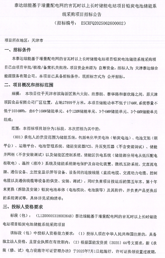 中國儲能網(wǎng)訊:7月17日,天津基于增量配電網(wǎng)174MW/1034MWh長時儲能電站項目鉛炭電池儲能系統(tǒng)采購發(fā)布。