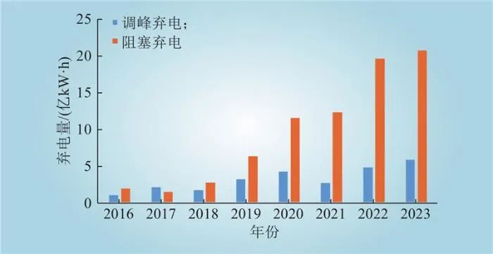 圖2 2016—2023年CAISO運(yùn)營(yíng)區(qū)域新能源調(diào)峰棄電和阻塞棄電分析