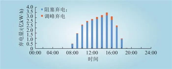 CAISO運(yùn)營(yíng)區(qū)域新能源棄電呈現(xiàn)“時(shí)段不均衡”特性,日內(nèi)棄電主要集中在09:00—18:00時(shí)段。CAISO運(yùn)營(yíng)區(qū)域日內(nèi)新能源棄電呈現(xiàn)“白天高、夜間低”的特征,白天光伏大發(fā)期間調(diào)峰棄電和阻塞棄電均大幅增加。今年以來,新能源日內(nèi)累計(jì)阻塞棄電量24.26億kW·h、占比94%,調(diào)峰棄電量1.66億kW·h、占比6%。今年以來CAISO運(yùn)營(yíng)區(qū)域新能源日內(nèi)累計(jì)調(diào)峰棄電和阻塞棄電分析如圖4所示。