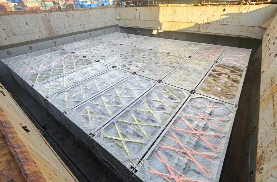 儲能柜屬9類危險品,價值高、重量大,為確保貨運(yùn)安全,特運(yùn)業(yè)務(wù)部門與技術(shù)團(tuán)隊(duì)深度交流,針對船舶底艙特點(diǎn),制定詳細(xì)裝載方案,并聯(lián)動所屬船技工程公司,趕制配套襯墊鋼板,在各相關(guān)方密切配合下,348臺儲能柜經(jīng)過悉心配載綁扎,全部符合海事局裝載規(guī)范,穩(wěn)穩(wěn)坐上特運(yùn)大船。