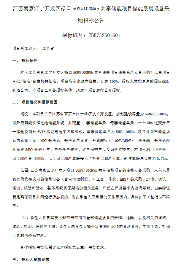 中國儲能網(wǎng)訊:7月22日,北京京能國際控股有限公司發(fā)布江蘇南京江寧開發(fā)區(qū)祿口50MW/100MWh共享儲能項目儲能系統(tǒng)設備招標公告。項目位于江蘇省,項目資金來源為自籌,比例100%。