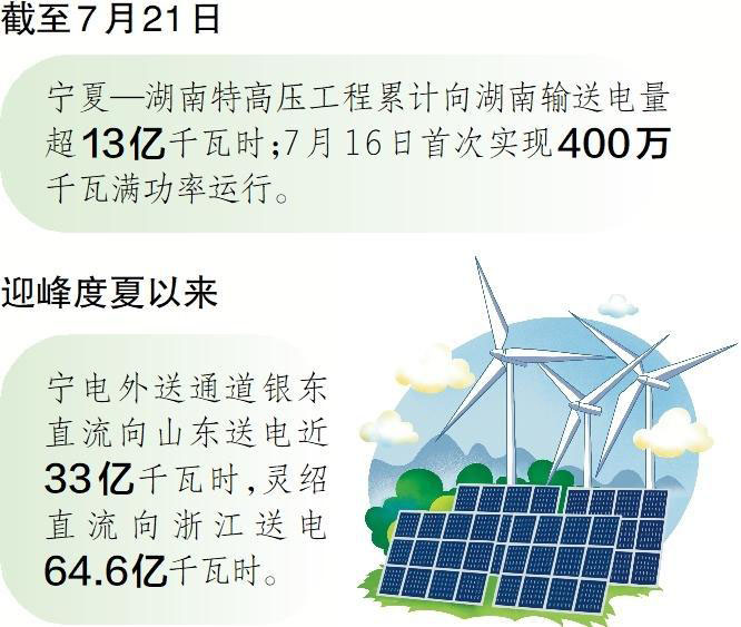 截至7月21日,±800千伏寧夏—湖南特高壓直流輸電工程累計(jì)向湖南輸送電量超13億千瓦時(shí),若按照每戶家庭日均空調(diào)用電20千瓦時(shí)計(jì)算,可滿足約6500萬戶家庭單日空調(diào)用電需求。