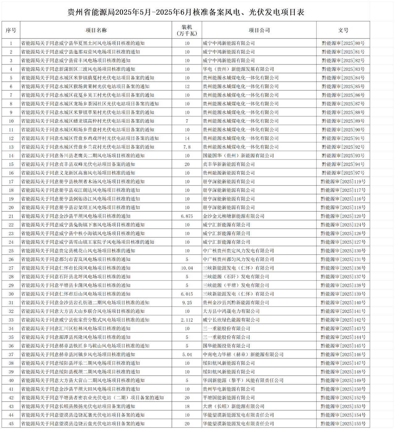 2025年5月-6月,貴州省能源局核準(zhǔn)備案風(fēng)電、光伏發(fā)電項(xiàng)目共45個(gè),規(guī)模合計(jì)438.132萬(wàn)千瓦。其中,光伏項(xiàng)目14個(gè),規(guī)模178.8萬(wàn)千瓦;風(fēng)電項(xiàng)目31個(gè),規(guī)模259.332萬(wàn)千瓦。