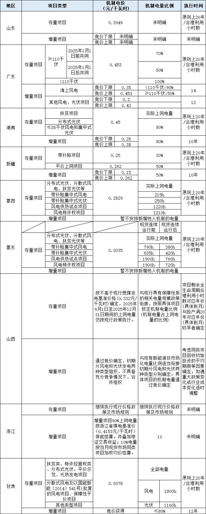 注:山東、廣東、湖南、山西、甘肅機制電量、電價政策為征求意見版本。