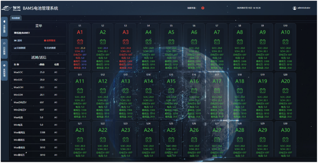全時全域智能監(jiān)控預警:實時監(jiān)測電池溫差、壓差、一致性及壽命等關鍵參數(shù),實現(xiàn)電池電流真實可控,防患于未然,保障電站全生命周期安全。