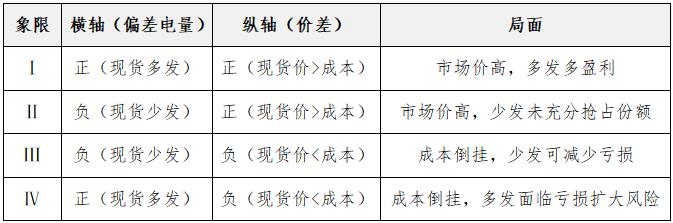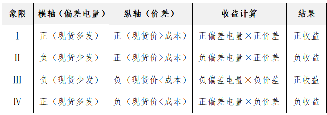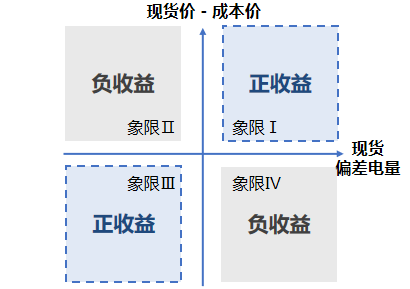 橫軸是現(xiàn)貨偏差電量,即現(xiàn)貨中標(biāo)量減去中長(zhǎng)期電量;零點(diǎn)(原點(diǎn))右側(cè)表示現(xiàn)貨中標(biāo)量 > 中長(zhǎng)期合約電量(正偏差,即現(xiàn)貨多發(fā));零點(diǎn)左側(cè)表示現(xiàn)貨中標(biāo)量 < 中長(zhǎng)期合約電量(負(fù)偏差,即現(xiàn)貨少發(fā))??v軸是現(xiàn)貨價(jià)與成本價(jià)之差;零點(diǎn)上側(cè)表示現(xiàn)貨價(jià) > 發(fā)電成本;零點(diǎn)下側(cè)表示現(xiàn)貨價(jià) < 發(fā)電成本。