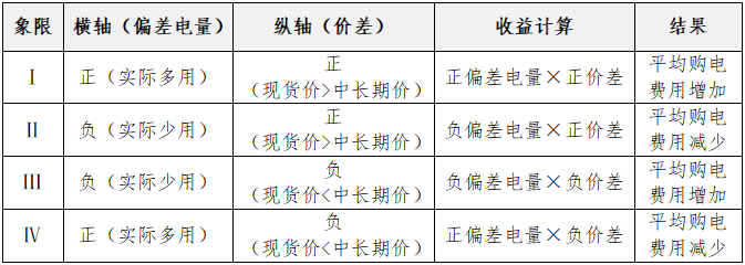 橫軸是現(xiàn)貨偏差電量,也即現(xiàn)貨中標(biāo)量減去中長(zhǎng)期電量;零點(diǎn)右側(cè)表示現(xiàn)貨中標(biāo)量 > 中長(zhǎng)期合約電量(正偏差,即實(shí)際多用);零點(diǎn)左側(cè)表示現(xiàn)貨中標(biāo)量 < 中長(zhǎng)期合約電量(負(fù)偏差,即實(shí)際少用)??v軸是現(xiàn)貨價(jià)格與中長(zhǎng)期合約價(jià)格之差;零點(diǎn)上側(cè)表示現(xiàn)貨價(jià) > 中長(zhǎng)期價(jià);零點(diǎn)下側(cè)表示現(xiàn)貨價(jià) < 中長(zhǎng)期價(jià)。