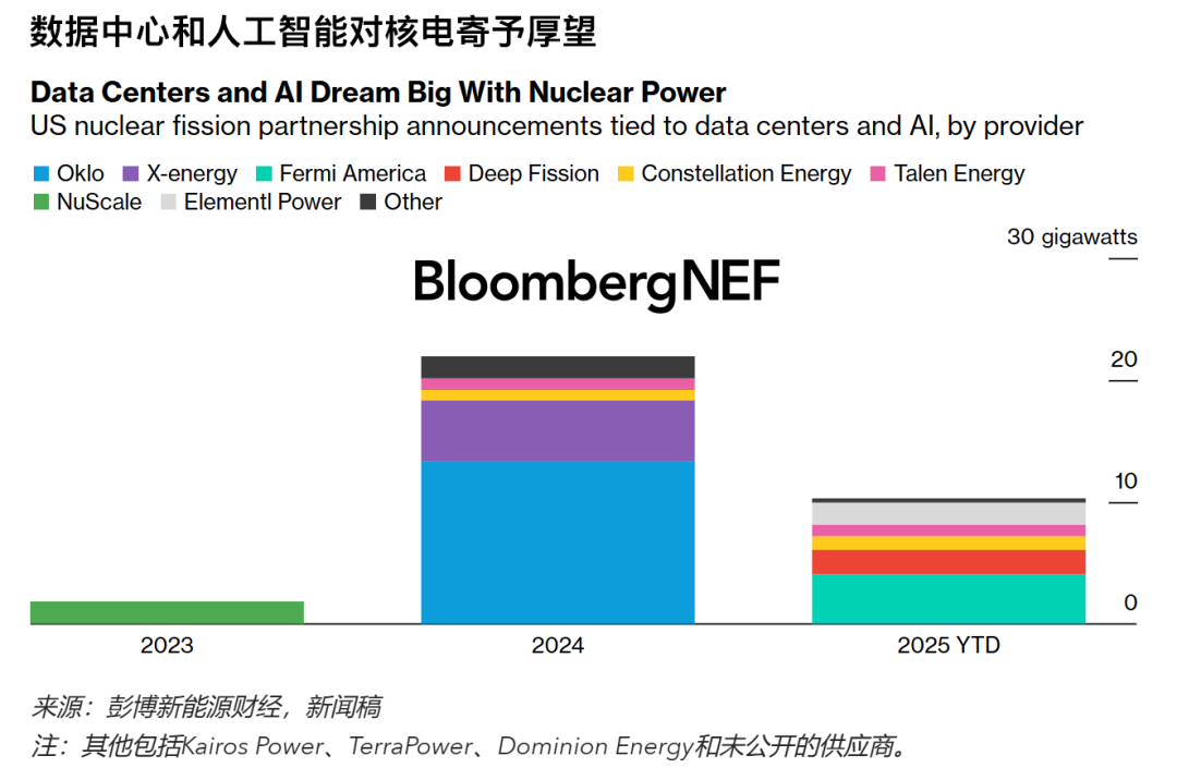 自2023年初以來,美國大型科技公司和數(shù)據(jù)中心提供商已宣布與18家核裂變電力供應商建立合作伙伴關系。彭博新能源財經(jīng)匯編的數(shù)據(jù)顯示,這些合作項目總計擁有32GW的龐大裝機儲備。但這些項目何時以及將有多少規(guī)模投入使用仍有待觀察,因為技術(shù)、許可和成本方面存在諸多挑戰(zhàn)。