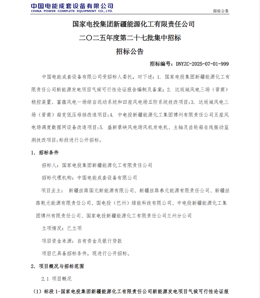 中國儲(chǔ)能網(wǎng)訊:7月28日,國家電投集團(tuán)新疆能源化工有限責(zé)任公司二〇二五年度第二十七批集中招標(biāo)公告發(fā)布。共劃分5個(gè)標(biāo)段,其中標(biāo)段一中4個(gè)新能源發(fā)電項(xiàng)目明確儲(chǔ)能規(guī)模,合計(jì)650MW/2300MWh。
