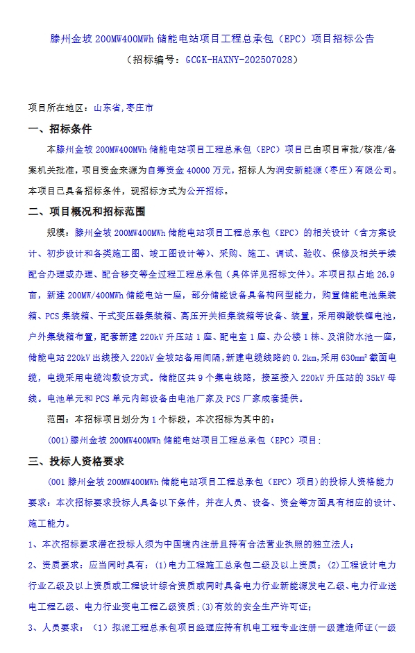 中國儲能網(wǎng)訊:7月28日,潤安新能源(棗莊)有限公司發(fā)布滕州金坡200MW400MWh儲能電站項目工程總承包(EPC)項目招標公告。項目位于山東省棗莊市,項目資金來源為自籌資金40000萬元,折合單價1元/Wh。