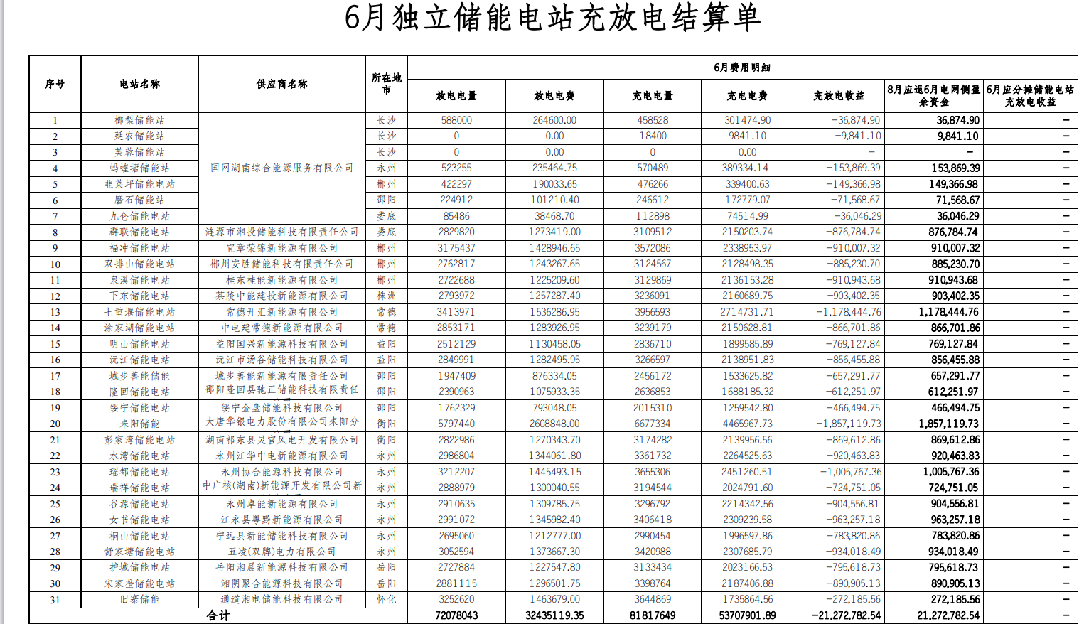 6月獨(dú)立儲(chǔ)能電站充放電結(jié)算單顯示,湖南31個(gè)獨(dú)立儲(chǔ)能電站的充放電收益為-2127.278254萬元,8月應(yīng)退6月電網(wǎng)側(cè)盈余資金2127.278254萬元。
