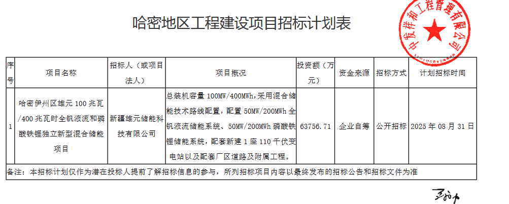 其中,哈密伊州區(qū)雄元100MW/400MWh全釩液流和磷酸鐵鋰獨立新型混合儲能項目招標人為新疆雄元儲能科技有限公司,為北京中拓能數(shù)智科技有限公司旗下。項目采用混合儲能技術路線配置,配置50MW/200MWh全釩液流儲能系統(tǒng)、50MW/200MWh磷酸鐵鋰儲能系統(tǒng),配套新建1座110千伏變電站以及配套廠區(qū)道路及附屬工程。