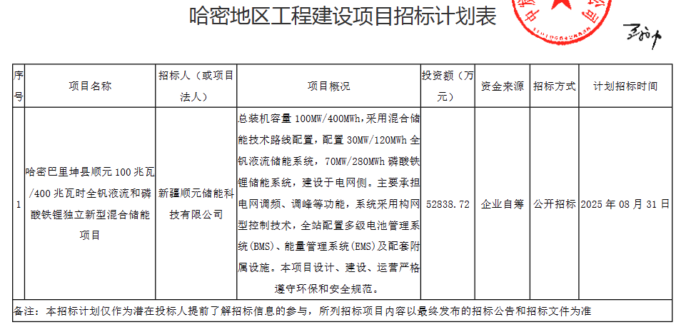 中國儲能網(wǎng)訊:7月29日,新疆哈密工程建設項目招標計劃表發(fā)布,共兩個招標項目,合計規(guī)模200MW/800MWh。