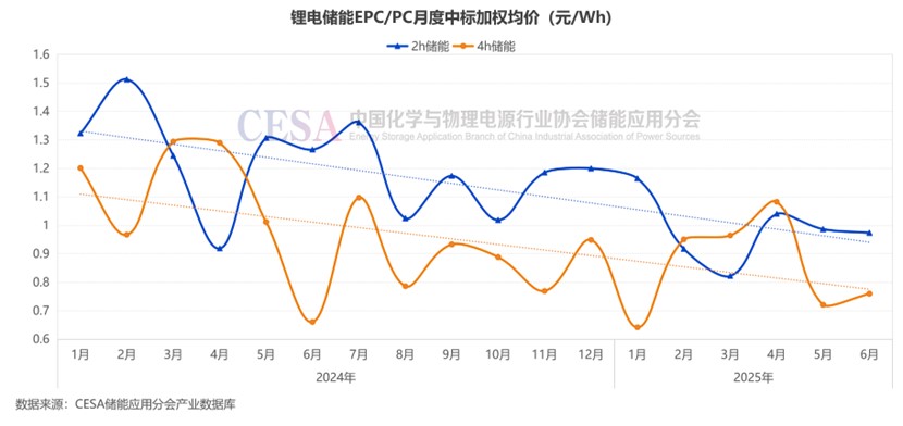 這一系列政策組合拳的出臺有著深刻行業(yè)背景。據(jù)CESA儲能應(yīng)用分會產(chǎn)業(yè)數(shù)據(jù)庫不完全統(tǒng)計,2024年鋰電儲能EPC中標(biāo)均價為1.175元/Wh,同比下降16.07%。2024年鋰電儲能系統(tǒng)中標(biāo)均價0.574元/Wh,同比下降47.82%。2025年1—6月,鋰電儲能EPC/PC中標(biāo)均價0.9618元/Wh,同比下降24.09%。2025年1—6月,鋰電儲能系統(tǒng)中標(biāo)均價0.4848元/Wh,同比下降29.94%。