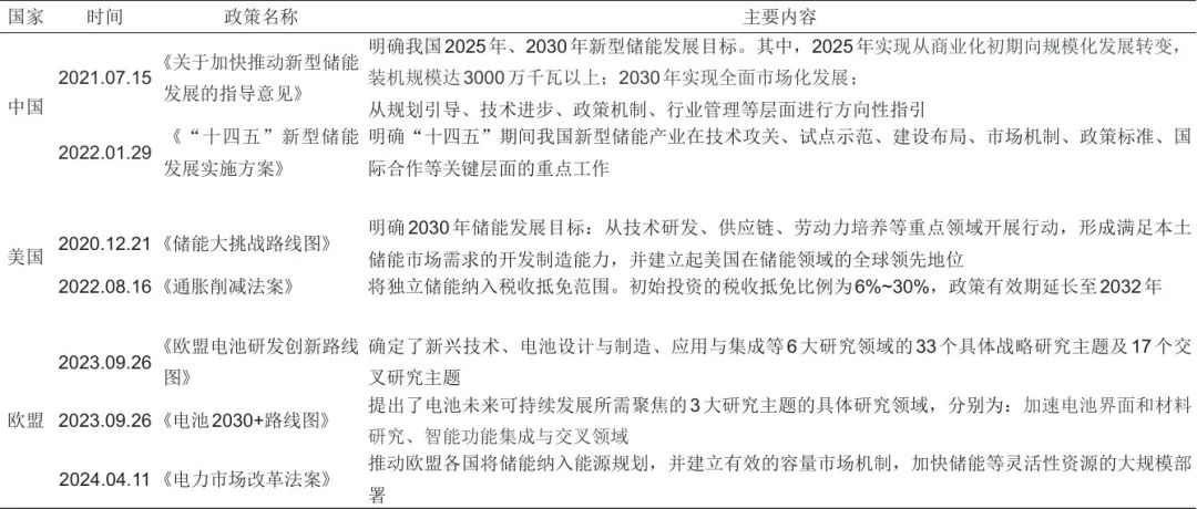 表1 中國(guó)、美國(guó)、歐盟三大主要經(jīng)濟(jì)體的儲(chǔ)能相關(guān)政策