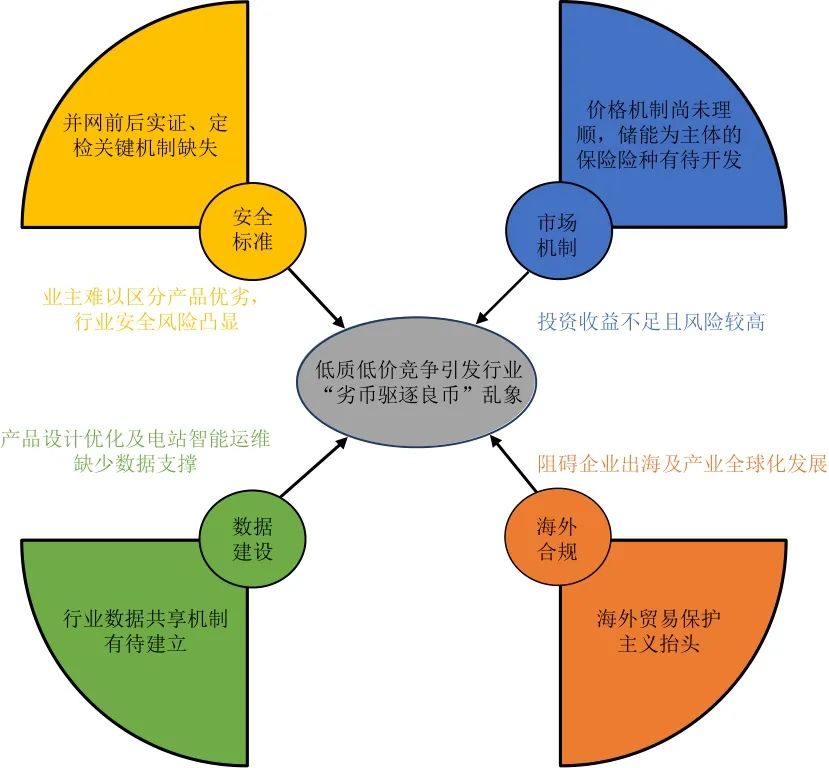 當(dāng)前,我國(guó)新型儲(chǔ)能已從研發(fā)示范階段轉(zhuǎn)向快速商業(yè)化推廣,低質(zhì)低價(jià)內(nèi)卷成為行業(yè)高質(zhì)量發(fā)展面臨的主要挑戰(zhàn)。此外,在安全標(biāo)準(zhǔn)、市場(chǎng)機(jī)制、數(shù)據(jù)建設(shè)以及海外合規(guī)等層面也存在一系列亟需解決的問(wèn)題(見圖3)。
