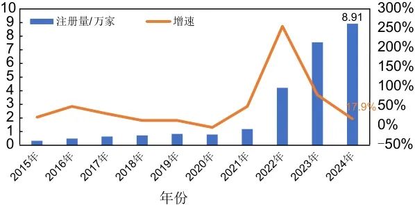 圖4 2015—2024年中國(guó)儲(chǔ)能企業(yè)年新增注冊(cè)量及增速