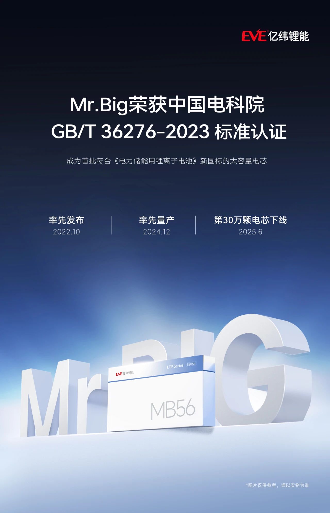 億緯鋰能628Ah超大容量電芯Mr.Big榮獲中國電科院GB/T 36276-2023標準認證