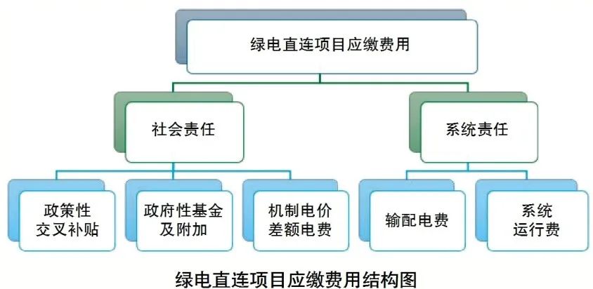 綠電直連項目作為新型能源產(chǎn)消融合發(fā)展模式,以提升新能源就近就地消納水平、滿足工商業(yè)用戶綠色用能需求為目標(biāo),應(yīng)公平合理承擔(dān)社會責(zé)任和系統(tǒng)責(zé)任。此處及后文綠電直連項目均指并網(wǎng)型項目,綠電直連項目應(yīng)繳費用情況如圖所示。