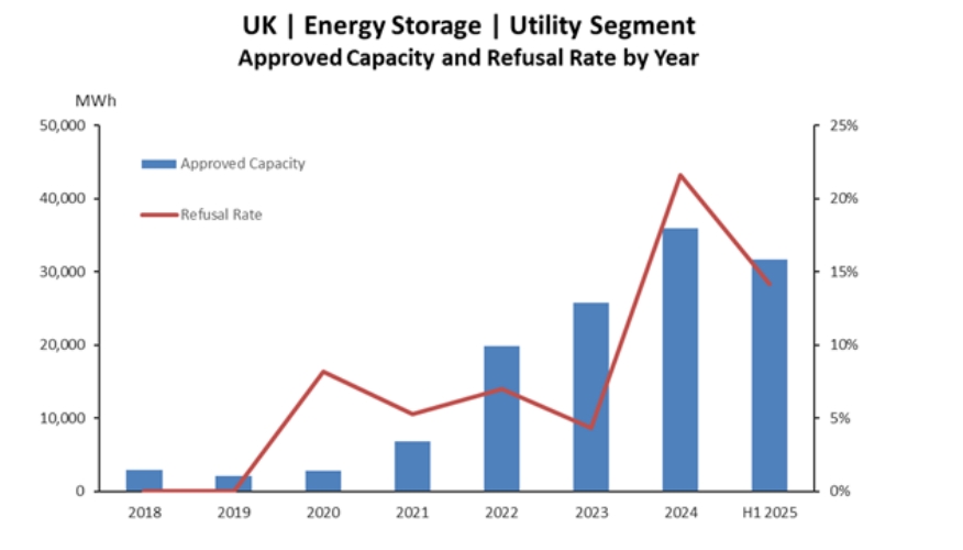 2025年上半年,英國完成部署的電池儲(chǔ)能項(xiàng)目?jī)?chǔ)能容量增長78%,提交規(guī)劃獲得審批的項(xiàng)目?jī)?chǔ)能容量增長25%,獲批的電池儲(chǔ)能項(xiàng)目?jī)?chǔ)能容量增長49%。