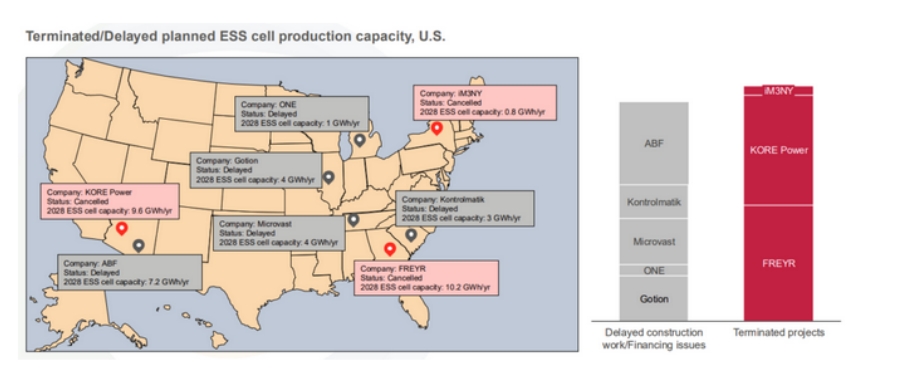 美國(guó)各州計(jì)劃終止/延遲建設(shè)的用于儲(chǔ)能系統(tǒng)的電池生產(chǎn)工廠